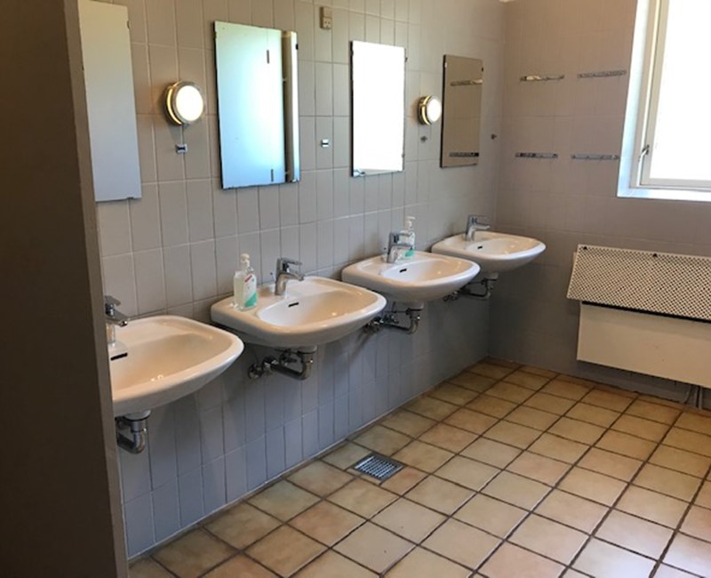 På værelsesgangen er der 2 toiletrum med hver 4 håndvaske, 3 toiletter og 1 bruser.