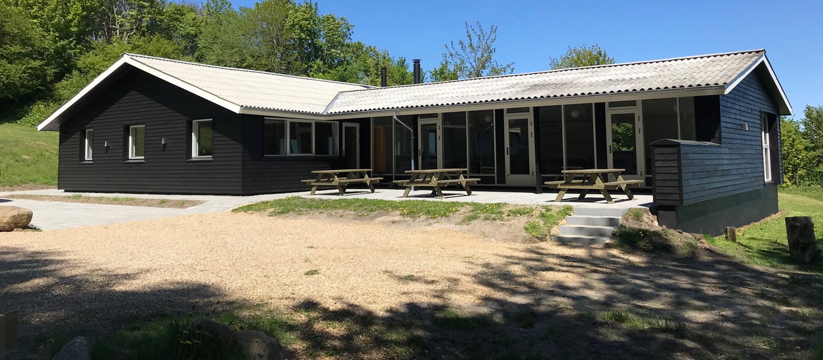 Der er en dejlig sydvendt terrasse lige udenfor salen og stuen med 3 borde/bænkesæt.