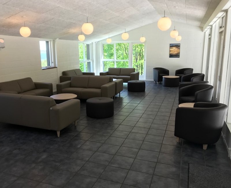 Der er endvidere en stor opholdsstue med brændeovn, sofaer og lænestole. Her er der panoramaudsigt mod fjorden.