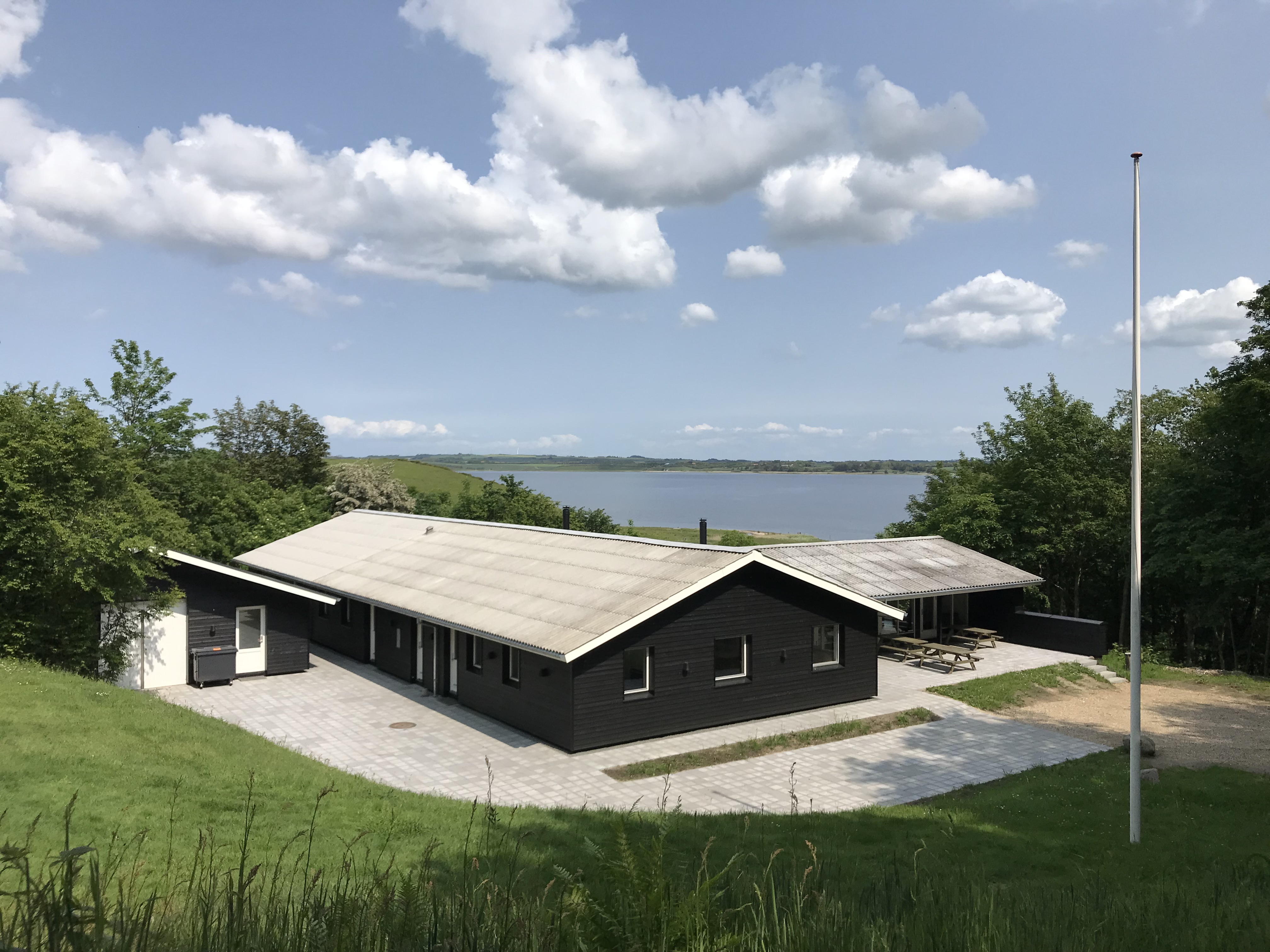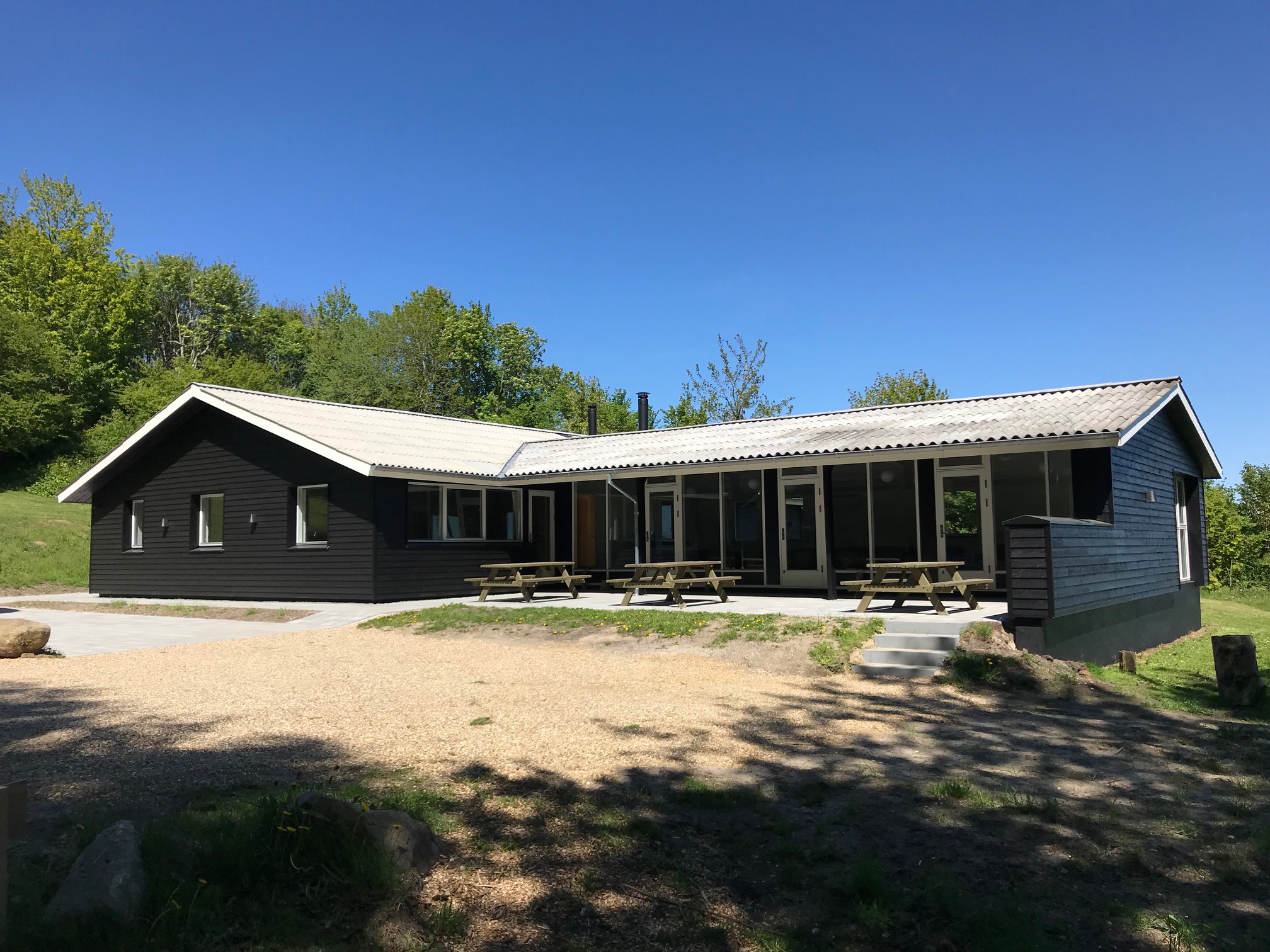 Der er en dejlig sydvendt terrasse lige udenfor salen og stuen med 3 borde/bænkesæt.